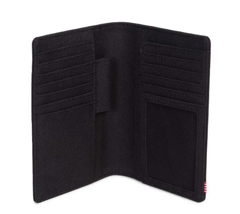 The RFID travel wallet is crafted using striped fabric liner, designed to keep your travel documents organized. This passport holder features a passport sleeve, a pen loop, multiple card slots, storage sleeves, mesh identification window, engineered red and white striped tab, and a classic Herschel Co. logo. Measuring 6 x 3.6 in, stay organized with this conveniently practical rfid passport holder, and always be on the go for a hassle-free, fun-filled vacation.